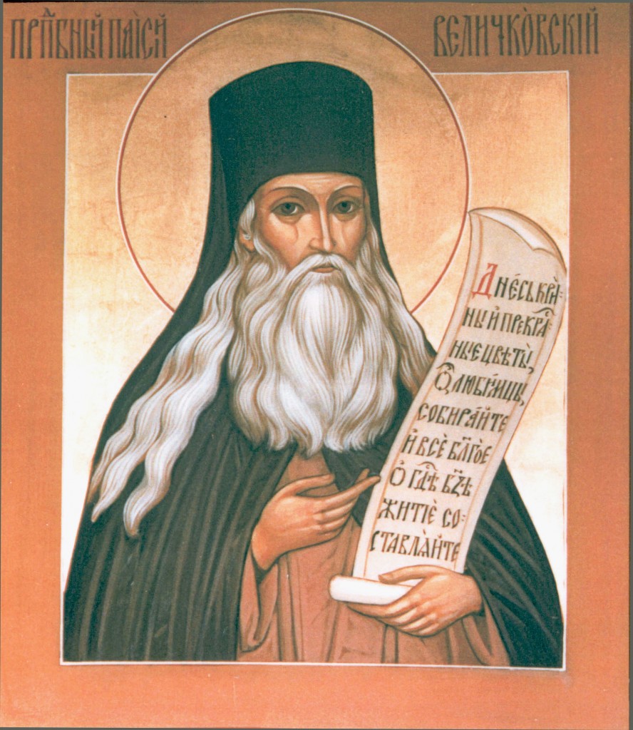 Quasi tre anni trascorse così in una beata solitudine ed in un fruttuoso silenzio: “ogni giorno rappresentava per lui il gradino più elevato su cui salire, preso, come era, dal desiderio di nuove lotte e godendo della fiamma rugiadosa dell’ardore divino”. In questo periodo di tempo giunse dalla Valacchia all’Athos il già menzionato ieromonaco Vasilij e, quando comprese quale sviluppo avesse preso la vita spirituale del giovane Platon, lo rivestì del piccolo abito monastico (Mikròn Schima) e gli ridiede il nome di Paisij. Erano passati intanto altri quattro anni, allorché a lui si rivolsero alcuni giovani monaci e lo pregarono di prenderli sotto la sua guida spirituale. Questi monaci erano alcuni di lingua moldava, altri slava. Poiché assai scarsi erano i monaci insigniti del sacerdozio, Paisij, in seguito alle insistenti preghiere dei suoi confratelli, dopo lunghe incertezze accettò di farsi consacrare sacerdote. Quindi ottenne dal Pròtos della Laura un vecchio kellìon disabitato, consacrato al profeta Elia, non lontano dal monastero del Pantokrator: Paisij vi edificò una chiesa, un refettorio e sessanta celle. Il rispetto e l’amore, di cui era oggetto da parte di tutti, erano tali che la sua Comunità cresceva di giorno in giorno. Ben presto le celle a disposizione non furono più sufficienti, per cui i monaci erano costretti a vivere in uno spazio ristretto ed in difficoltà economiche. Paisij considerò se non fosse il caso di ritornare in Valacchia e costruirvi tra i monti un nuovo monastero. Perciò partì con sessanta monaci alla volta di Costantinopoli e di Galatz, donde passò in Valacchia. Ma siccome non trovò alcuna località adatta al suo scopo, si recò a Jassy ed ebbe a disposizione dal metropolita della Moldavia il monastero di Dragomirna intitolato alla discesa del Santo Spirito. Qui Paisij, che nel frattempo aveva ricevuto anche il grande abito angelico (Méga Schima), introdusse la vita cenobitica secondo le norme di san Basilio e san Teodoro Studita. Per quanto concerneva l’ufficio liturgico introdusse la prassi dell’Athos. In chiesa il coro di destra cantava in slavo ecclesiastico, quello di sinistra in moldavo. Nessun monaco poteva chiamare un oggetto “mio” o “tuo”, poiché tutto era comune, così come Dio lo ha creato, i pasti venivano consumati in comune e solo i malati o quanti erano di salute cagionevole potevano assentarsi dal refettorio. Tutti i lavori del monastero erano compiuti esclusivamente dai monaci, che vi attendevano con tutte le loro forze e con timore di Dio. Infatti il lavoro in comune allontanava dall’animo la disobbedienza, lo spirito di opposizione e l’ostinatezza, che distruggono i comandamenti divini. Giacché, di ogni altra virtù conta per prima la rinunzia alla propria volontà ed alle proprie idee. Con il “silenzio sulle labbra e la preghiera nel cuore” ognuno fa il proprio dovere, serve l’igumeno ed i confratelli con prontezza d’animo ed amore. Nella cella il monaco legge la Sacra Scrittura e le opere dei Padri e, tra le lacrime e le metanie, prega il Signore e la sua purissima Madre, che lo guardano dalle icone e gli danno forza. Chi ha compiuto pregressi nella vita spirituale attende, con l’autorizzazione dello Staretz, alla preghiera del cuore. Ogni sera i novizi debbono confessarsi dallo staretz. La sera, nel tempo libero dagli uffici in chiesa, i monaci si riunivano, tenendo ceri accesi, in refettorio e lo Staretz leggeva e commentava brani delle opere ascetiche di san Basilio, di san Teodoro Studita o di san Simeone il Nuovo Teologo. Le letture ed il commento in slavo ecclesiastico si alternavano a quelle in moldavo. Mentre si leggeva in una lingua, i monaci che usavano l’altra cantavano l’Akathistos in Chiesa.