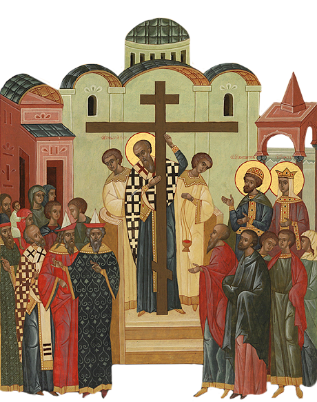 La festa dell’Esaltazione riassume e richiama alcuni eventi storici legati al santo Legno, principalmente la scoperta della Vera Croce. Una tradizione formatasi abbastanza presto riferisce che sant’Elena, madre dell’imperatore Costantino, aveva ritrovato a Gerusalemme, presso il Golgota, le tre croci usate per Gesù Cristo e i due ladroni; una guarigione miracolosa, avvenuta al contatto con una d’esse, permise il riconoscimento della croce del Salvatore e di mostrarla alla venerazione del popolo. Appena la notizia della scoperta si diffuse nella Città Santa, una vasta folla si radunò per venerare la Croce del Signore. Il Patriarca di Gerusalemme, san Macarios, la portò su di un pulpito: e quando il popolo la vide innalzata verso l’alto, tutti assieme gridarono, decine di volte “Kyrie eleison”, un evento questo ricordato nel servizio di oggi, con la frequente ripetizione dei “Kyrie eleison” alla cerimonia dell’Esaltazione. Da allora una parte del sacro legno venne conservata nella basilica dell’Anàstasis (detta Santo Sepolcro dai latini), altre parti del sacro legno furono portate a Roma dalla stessa sant’Elena, che le custodì nella cappella della sua abitazione romana, divenuta il monastero di Santa Croce in Gerusalemme.