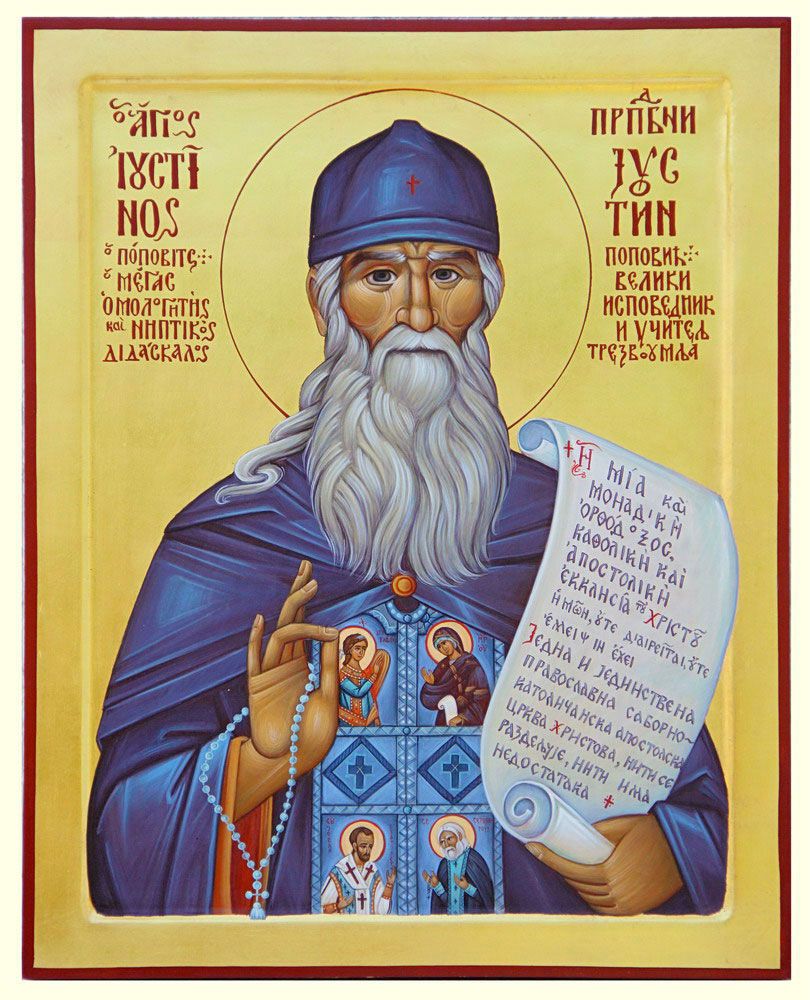 Già dalla prima giovinezza padre Justin si dedicò moltissimo alla preghiera. All’età di vent’anni annotava per sé in modo caratteristico: “La preghiera è una prosfora impastata di sangue e di cuore”. Già in queste parole in lui è presente la consapevolezza ed il sentimento del carattere personale e liturgico della preghiera e dello spirito della preghiera. Egli sempre insistette sul significato della preghiera personale per ogni essere umano, ed in particolare per il cristiano credente. Padre Justin la praticò per tutta la vita. “Bisogna ricordarsi di Dio nella preghiera più che respirare”, diceva san Gregorio il Teologo. E sulle sue orme ripeteva san Sava: “La preghiera è stata sempre per me la più grande beatitudine su questa terra”. Seguendo l’esempio di questi due e degli altri santi intercessori, compose il suo Evangelo di preghiere anche Abba Justin: “La preghiera è un consumarsi nel fuoco ed un cuocere se stesso, l’offerta di se in olocausto… La lampada delle mia preghiera arde senza mai spegnersi dinanzi al volto miracoloso del Signore solo quando incessantemente le verso goccia a goccia il sangue del mio cuore”.