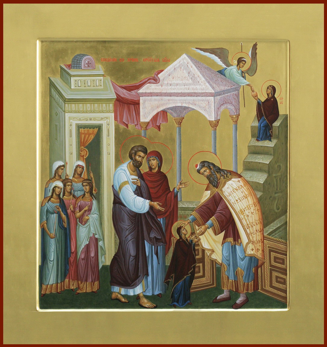 Anche l’iconografia riprende questo testo della Tradizione: Gioacchino ed Anna, preceduti da un corteo di vergini, nell’atto di presentare la piccola Maria al sacerdote, perché l’accolga nel Tempio, ove rimarrà fino all’adolescenza. Maria ha la statura di una bambina e i tratti di un’adulta, è rappresentata in piedi sui gradini del Tempio mentre apre le mani al sacerdote in segno di offerta di sé. La tenda rossa stesa dai tetti degli edifici alla colonna del baldacchino rappresenta il lembo del manto del Signore della visione di Isaia[2], e indica che la scena avviene all’interno del Tempio. Nell’icona viene anche rappresentato il corteo di vergini recanti ceri accesi che accompagna Maria e, in una stanza alta del santuario, nel cuore del Tempio, la Vergine che riceve dall’angelo il nutrimento divino, il pane della contemplazione.