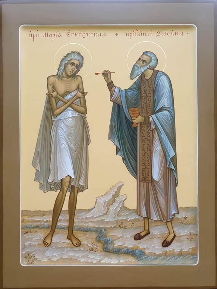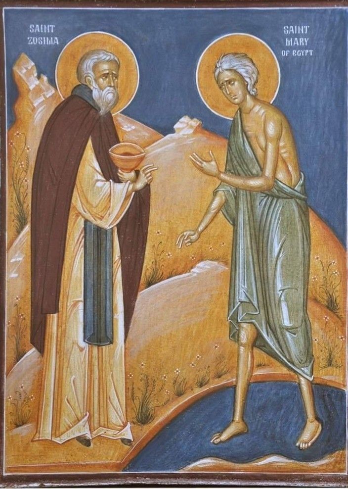 Quando poi giunse e iniziò la prima sacra domenica dei digiuni, subito dopo la consueta preghiera alcuni di coloro che salmodiavano uscirono; egli invece, trattenuto dalla debolezza per un po’ di febbre, rimase all’interno del monastero. Zosima allora si ricordò che gli era stato predetto da quella santa che anche volendolo non sarebbe stato in grado di uscire. Trascorsi poi alcuni giorni, ripresosi dalla debolezza, viveva nel monastero. Quando i monaci ritornarono, la sera della santa cena, fece ciò che gli era stato comandato e, mettendo in un piccolo calice una porzione dell’incontaminato corpo e del prezioso sangue del Signore nostro Gesù Cristo, pose in un canestro un po’ di fichi, dei frutti di palma, cioè dei datteri, e un po’ di lenticchie bagnate in acqua. Giunse verso sera e si sedette lungo la riva del Giordano, aspettando la venuta della santa. Ma poiché quella donna beatissima tardava, Zosima non si addormentò, ma con sollecitudine guardava attentamente verso il deserto, attendendo ciò che desiderava vedere. Diceva poi in se stesso: “Forse è venuta e non mi ha trovato ed è andata via?”. Dicendo queste cose piangeva e alzando gli occhi al cielo scongiurava Dio con suppliche, dicendo: “Non impedirmi, Signore, di rivedere colei che mi hai concesso di vedere. Non me ne vada via vuoto, portando a mio rimprovero i miei peccati”.