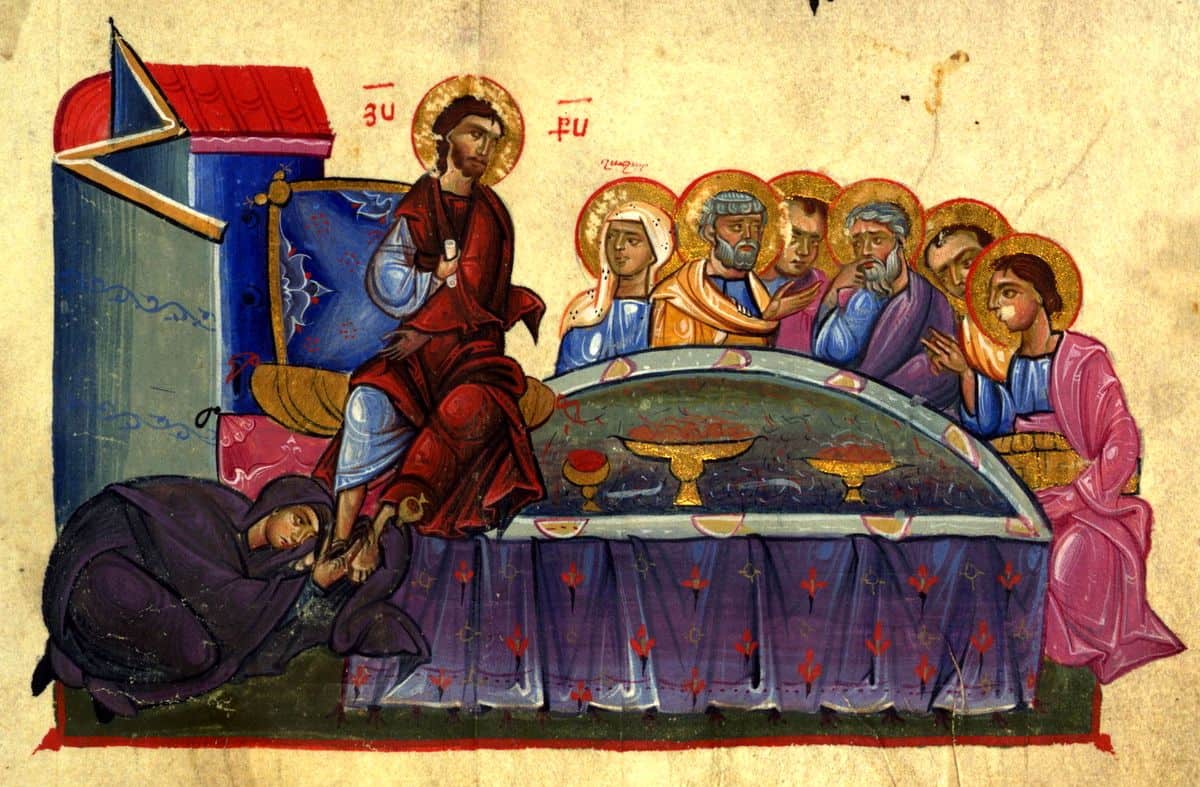 Nel Santo e Grande Mercoledì, i Santi Padri hanno stabilito di commemorare la donna peccatrice che unse con mirra il Signore, poiché ciò avvenne poco prima della Sua salvifica Passione.